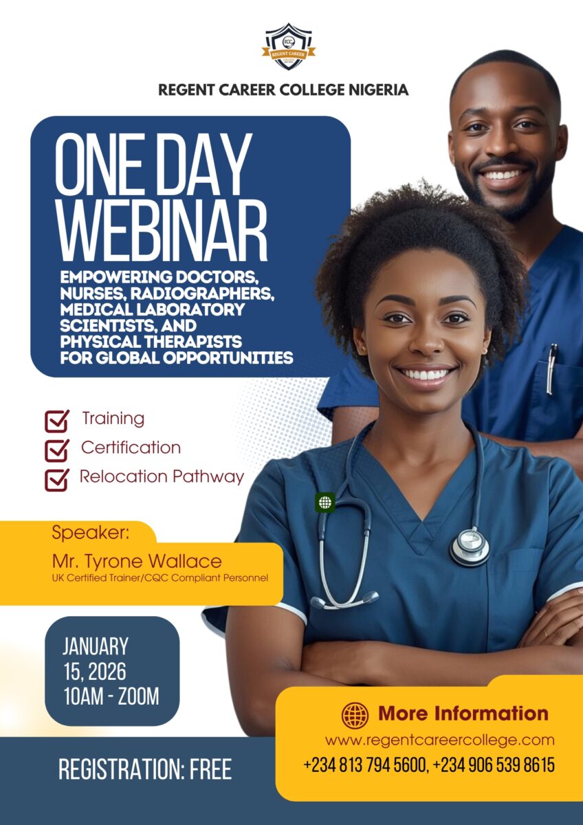 Regent Career College Nigeria warmly invites Doctors, Nurses, Radiographers, Medical Laboratory Scientists, and Physical Therapists to a FREE one-day webinar focused on preparing healthcare professionals for global opportunities.